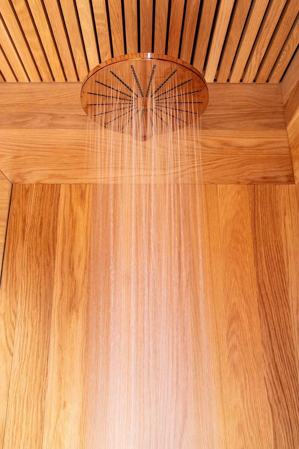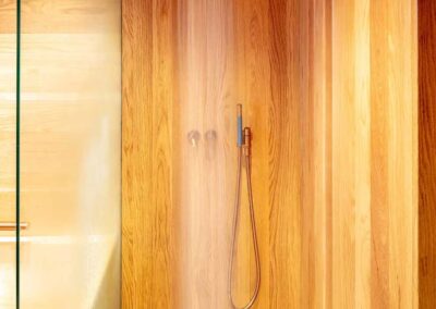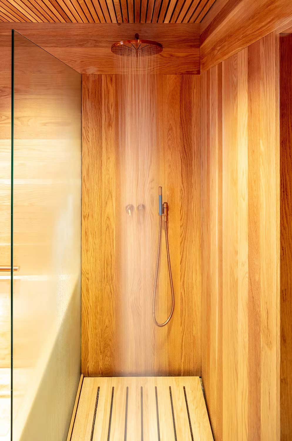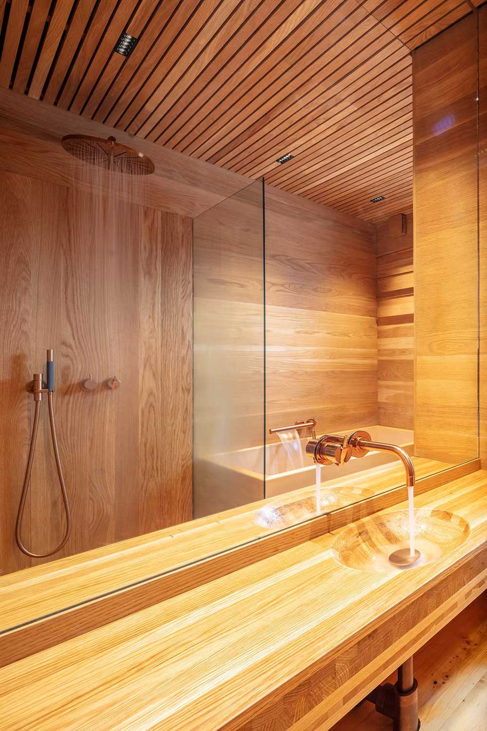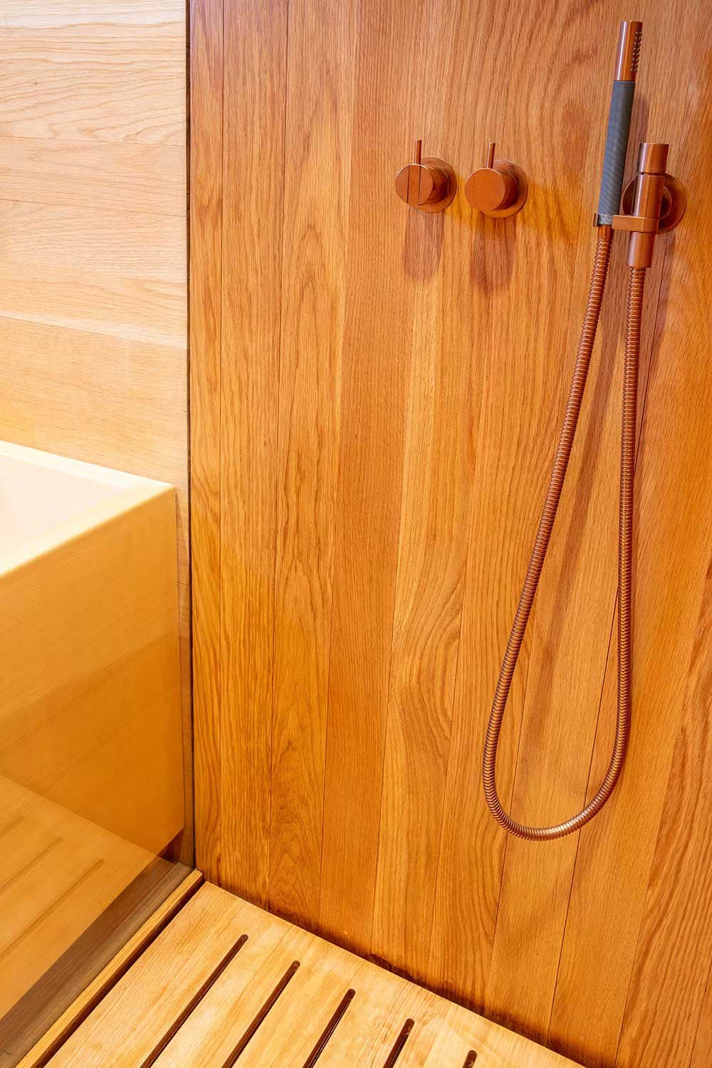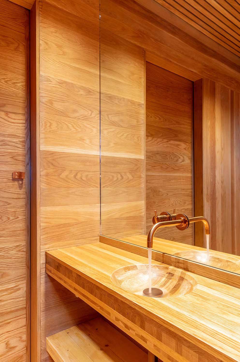 Revestido con paneles de roble rojo americano, construido como una estructura ventilada que crea una cámara ventilada entre el revestimiento y el aislamiento. El roble está tratado con aceite natural Mafi de difusión abierta. El lavabo de roble macizo está fabricado con recortes de la instalación, encolados, prensados y fresados con CNC. La bañera es de madera de ciprés sin tratar y desprende un sutil aroma a madera dulce al llenarse de agua. La estructura es de cobre cepillado. La ducha está fabricada con láminas de roble verticales para facilitar el drenaje del agua a través de una rejilla de suelo de roble. La ducha está tratada con cera de aceite OSMO de difusión abierta.