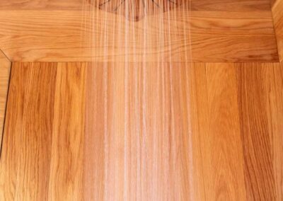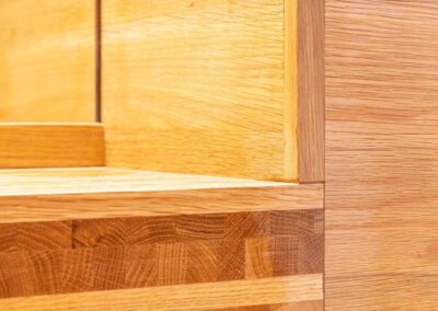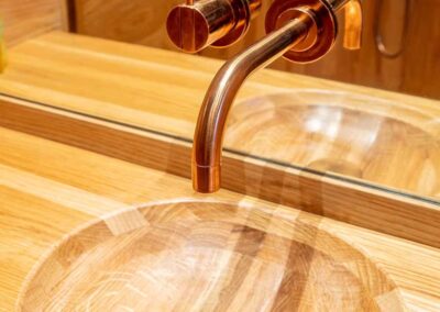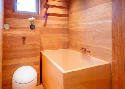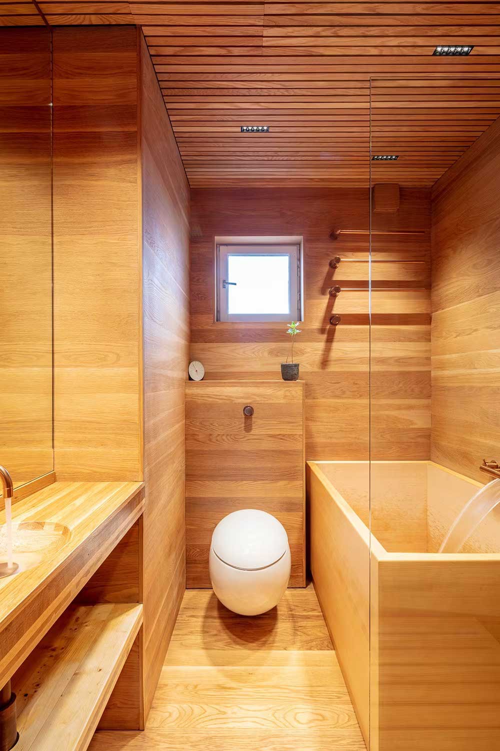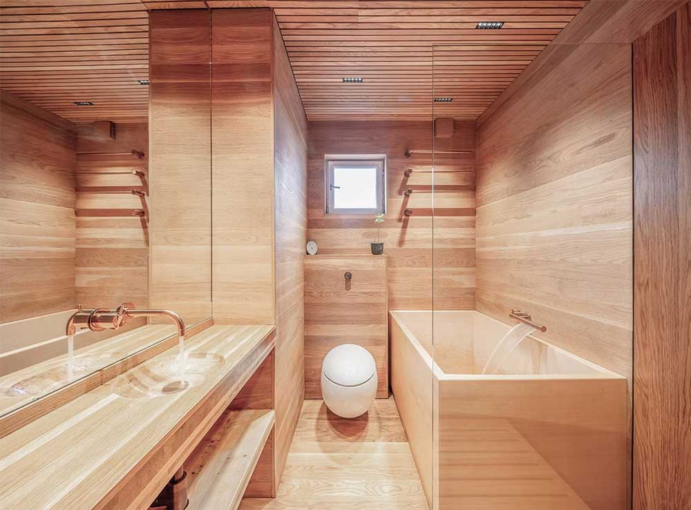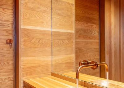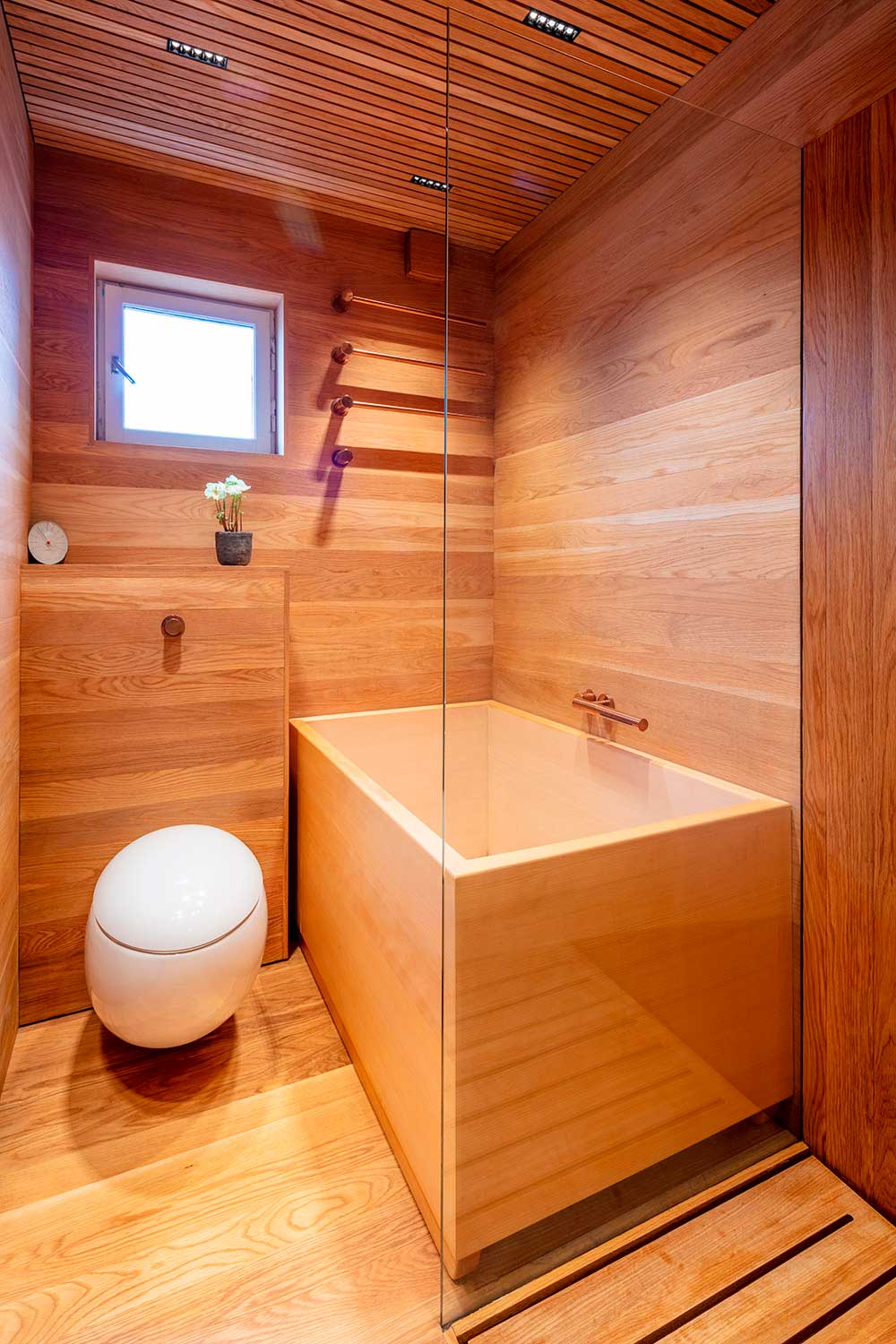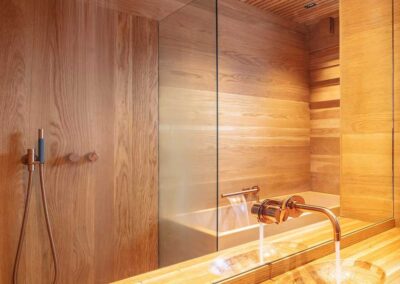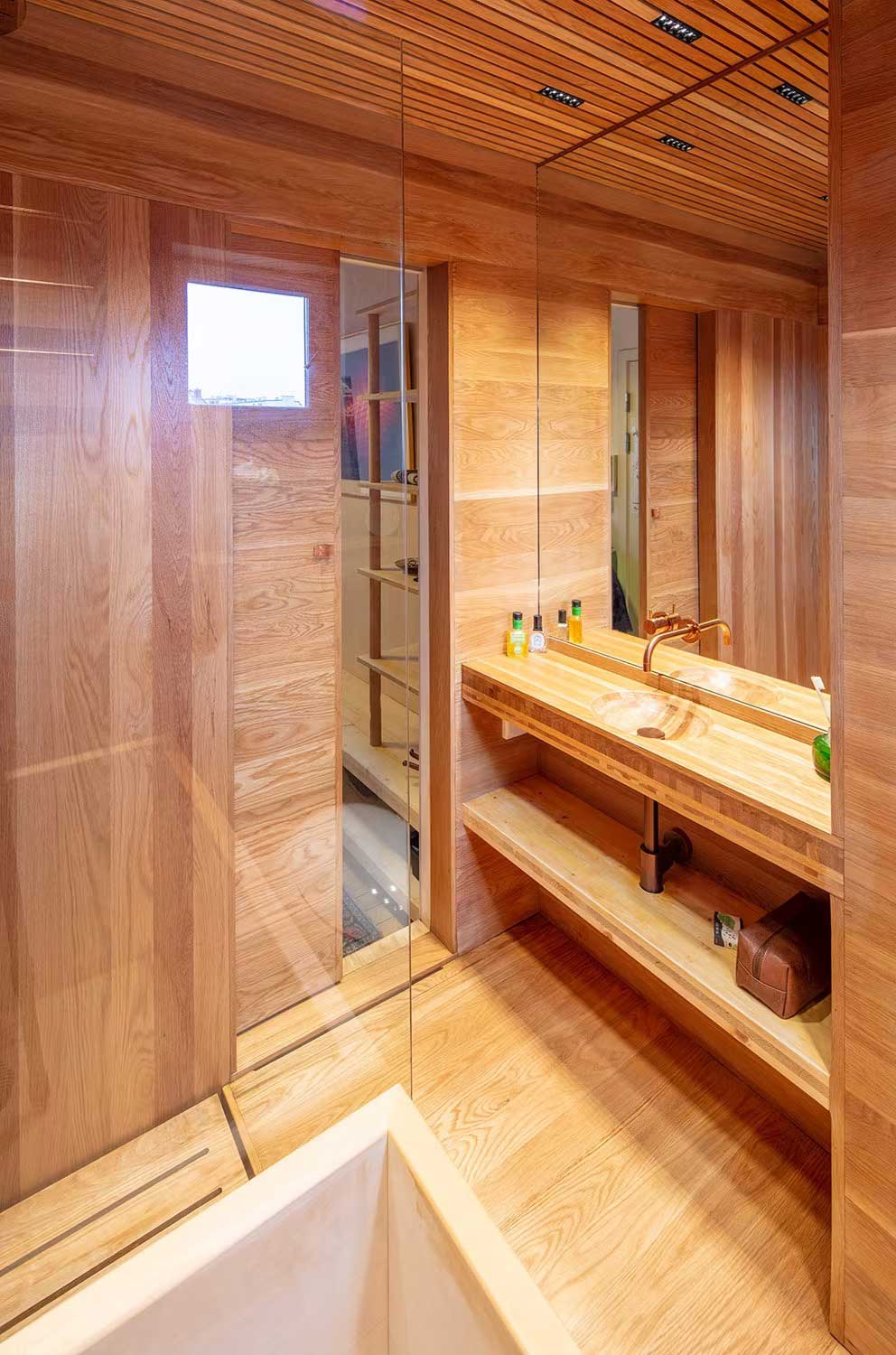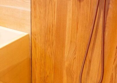 Revestido con paneles de roble rojo americano, construido como una estructura ventilada que crea una cámara ventilada entre el revestimiento y el aislamiento. El roble está tratado con aceite natural Mafi de difusión abierta. El lavabo de roble macizo está fabricado con recortes de la instalación, encolados, prensados y fresados con CNC. La bañera es de madera de ciprés sin tratar y desprende un sutil aroma a madera dulce al llenarse de agua. La estructura es de cobre cepillado. La ducha está fabricada con láminas de roble verticales para facilitar el drenaje del agua a través de una rejilla de suelo de roble. La ducha está tratada con cera de aceite OSMO de difusión abierta.