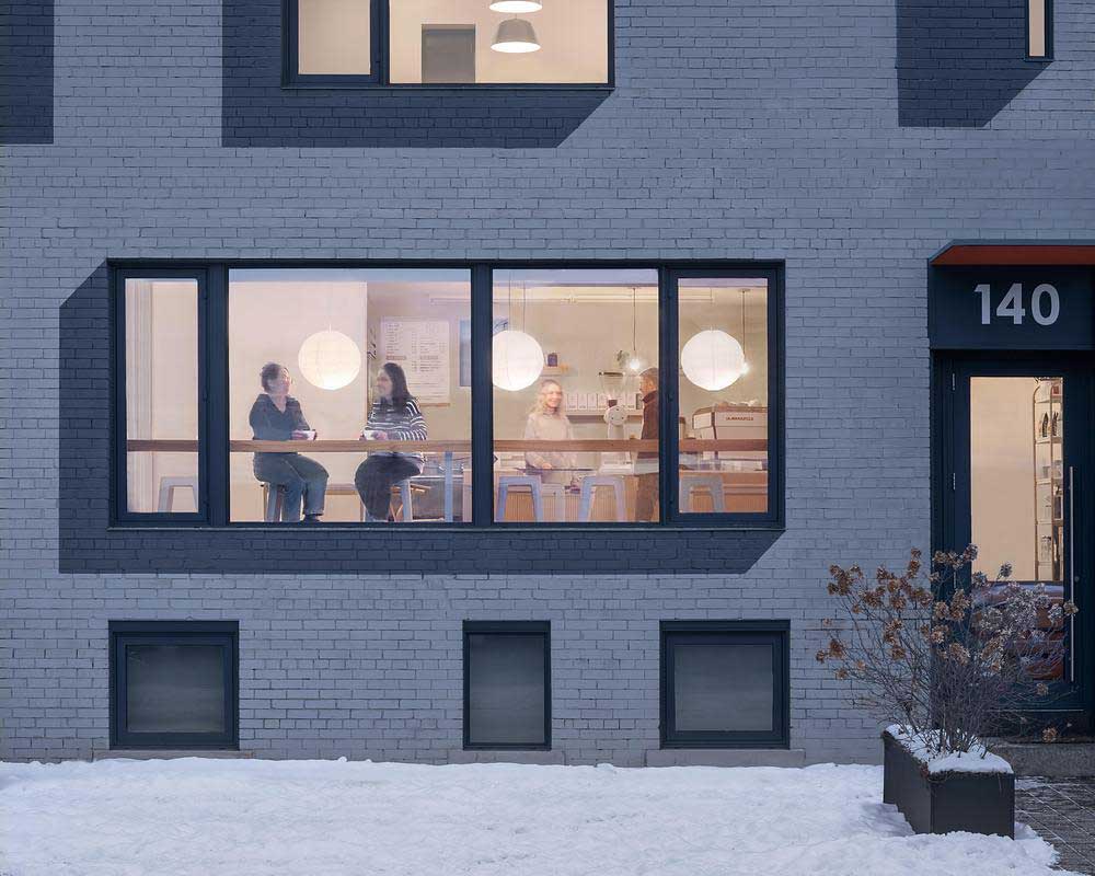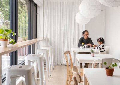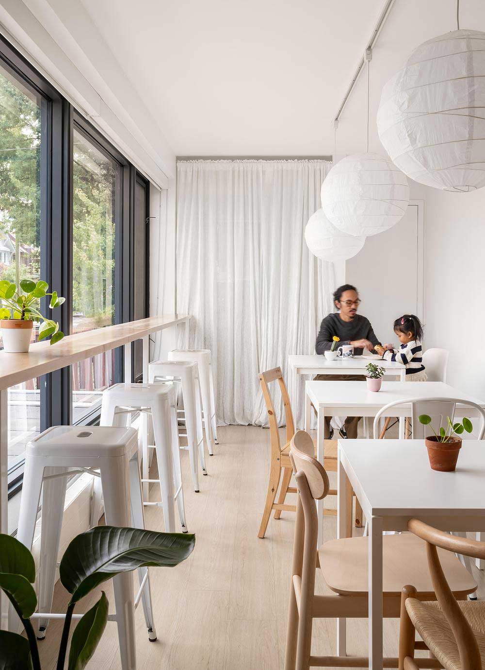 La distribución del espacio se organiza en una serie de zonas lineales, cada una con una función distinta. En un extremo, la zona de preparación de café y comida, tras el mostrador de servicio, está diseñada para optimizar el flujo de trabajo. En el lado opuesto, la zona de circulación de clientes está conectada a una pequeña zona de asientos, que se transforma en una larga barra situada justo delante de un gran ventanal orientado al este, ofreciendo un espacio luminoso y acogedor para observar a la gente. Esta disposición optimiza el espacio compacto, garantizando un flujo fluido de clientes. Una pequeña cocina, situada en la parte trasera, permite a los propietarios preparar productos horneados y sándwiches recién hechos.