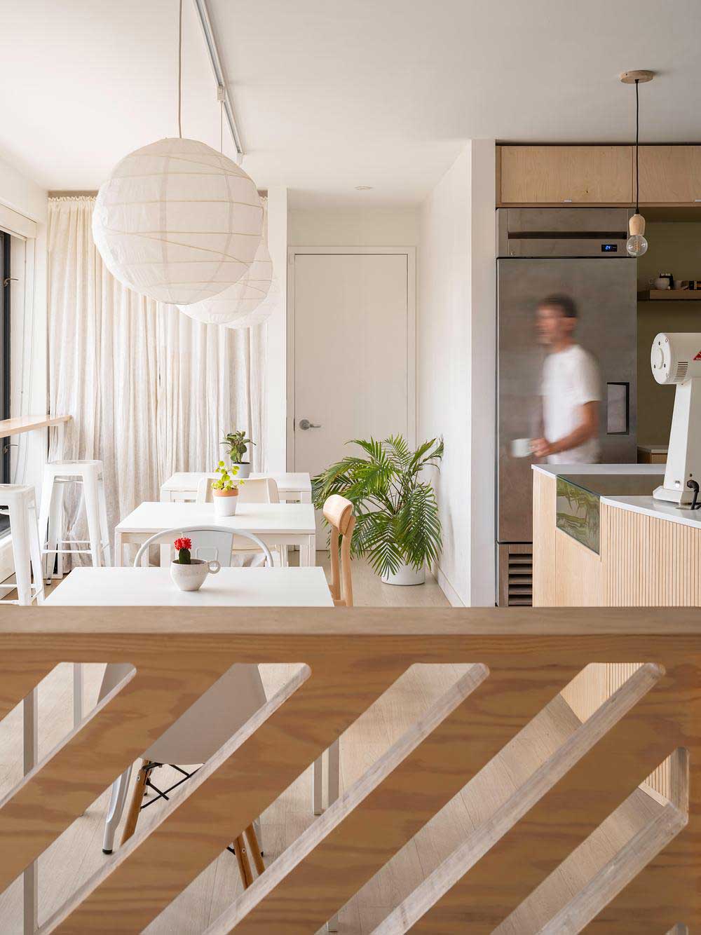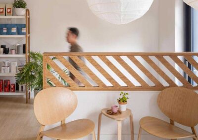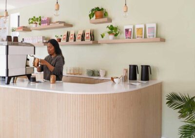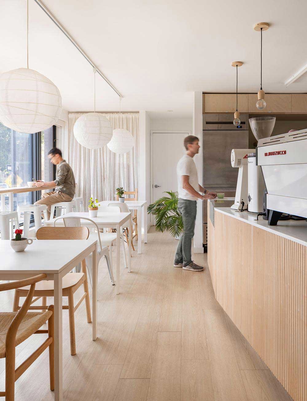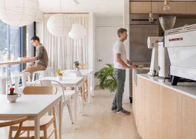 Construido con un presupuesto modesto, el diseño emplea materiales prácticos y con carácter. El resistente suelo de vinilo de ingeniería garantiza un fácil mantenimiento, mientras que la carpintería de contrachapado de arce de alta calidad aporta calidez, otorgando al espacio un carácter suntuoso y a la vez sobrio. Elementos como la mampara de listones de madera en la entrada definen sutilmente las distintas zonas, a la vez que mantienen la sensación de amplitud y amplitud del espacio. Una pared verde suave y acabados en madera clara crean una atmósfera inspiradora, complementada por estanterías flotantes con productos de café seleccionados y vegetación que aportan funcionalidad y atractivo visual.