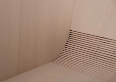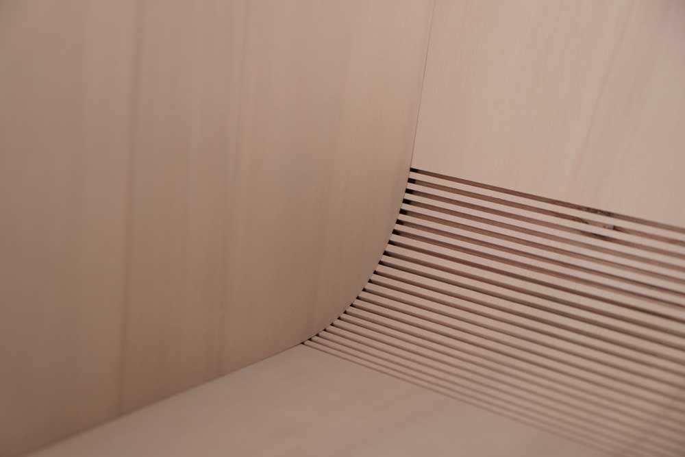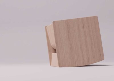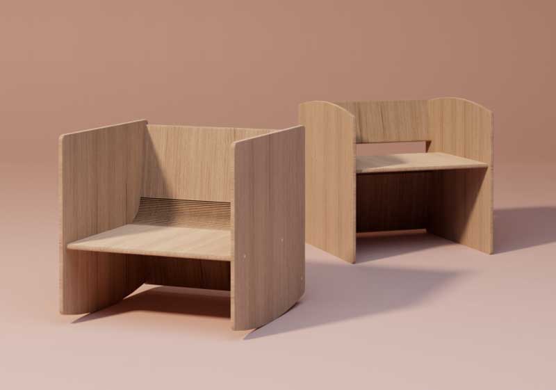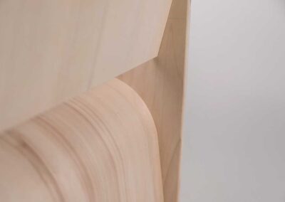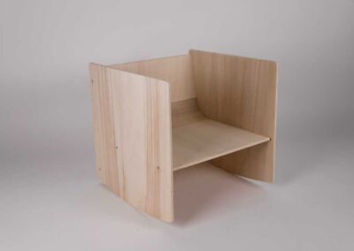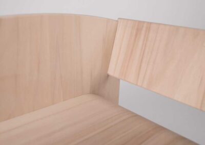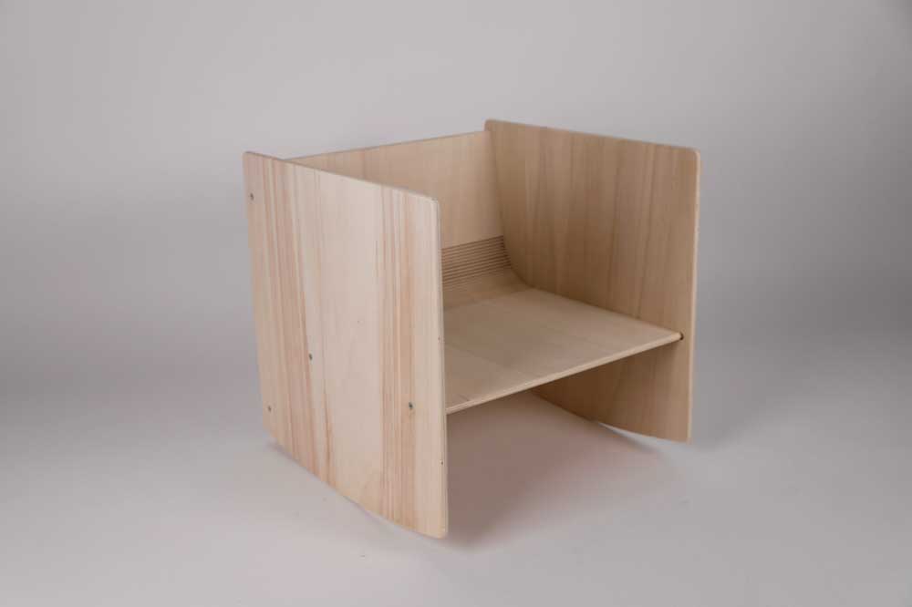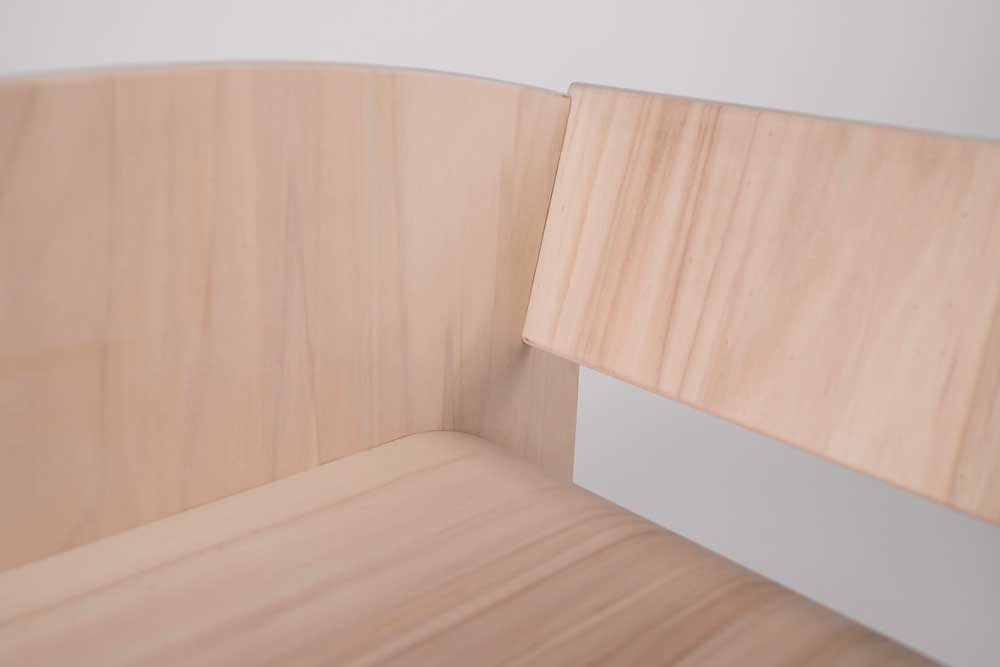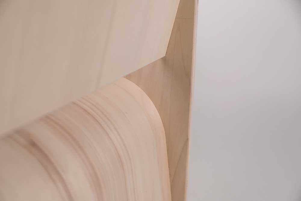 Flip está fabricada con paneles recortados de chapa de abedul, lo que permite su embalaje plano. El asiento está doblado y fijado con tornillos en las ranuras fresadas de los paneles laterales. Esto hace que sea fácil para el usuario montar la silla en casa y al mismo tiempo mantener la apariencia elegante de la madera curvada.