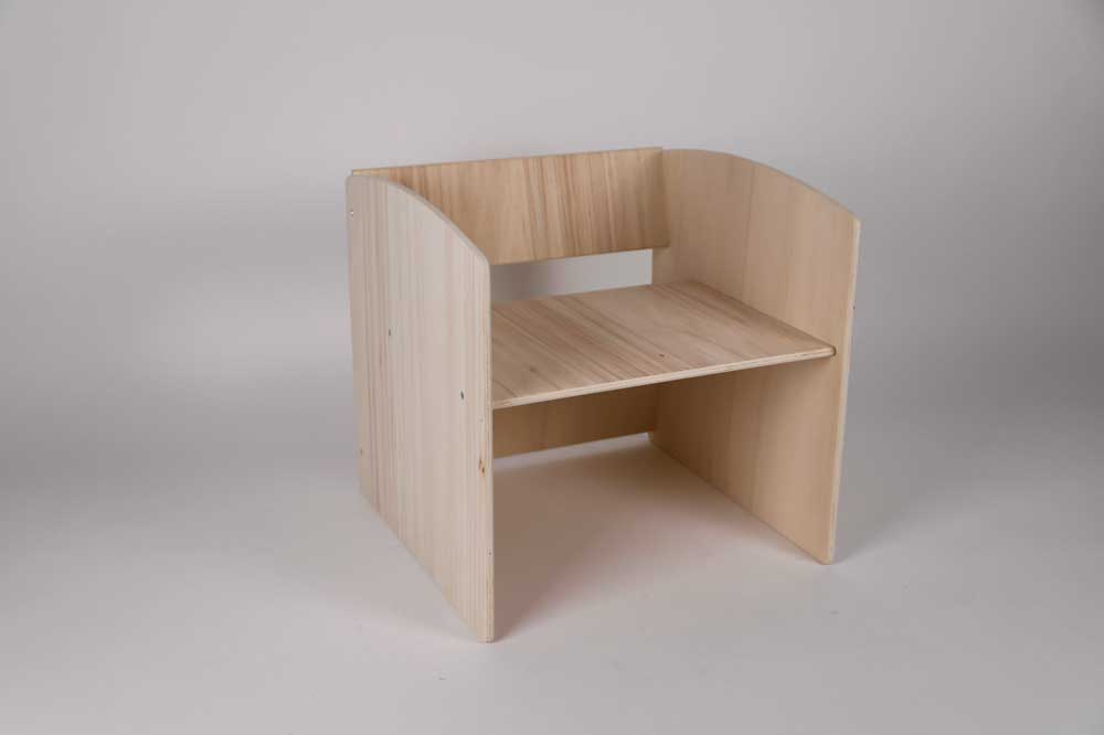 Los laterales de la silla tienen una forma convexa que le permite funcionar como una mecedora. Este lado cuenta con un asiento bajo y laterales altos, que evitan que el usuario se pille los dedos debajo de la silla, a la vez que proporcionan un espacio cómodo para que el niño se acomode y se sienta seguro. El otro lado forma una silla estable con un asiento a la misma altura que una silla infantil estándar. El respaldo de la silla estable también actúa como tope para la mecedora, lo que dificulta que el usuario la incline hacia atrás mientras se mece.