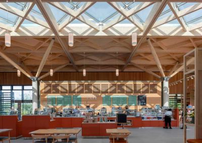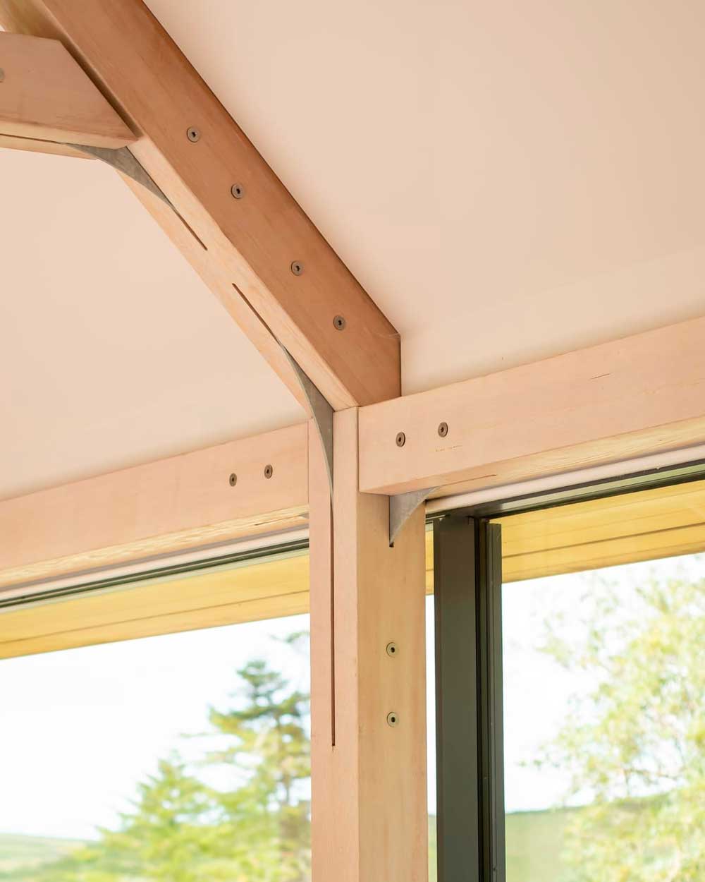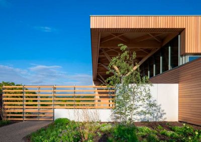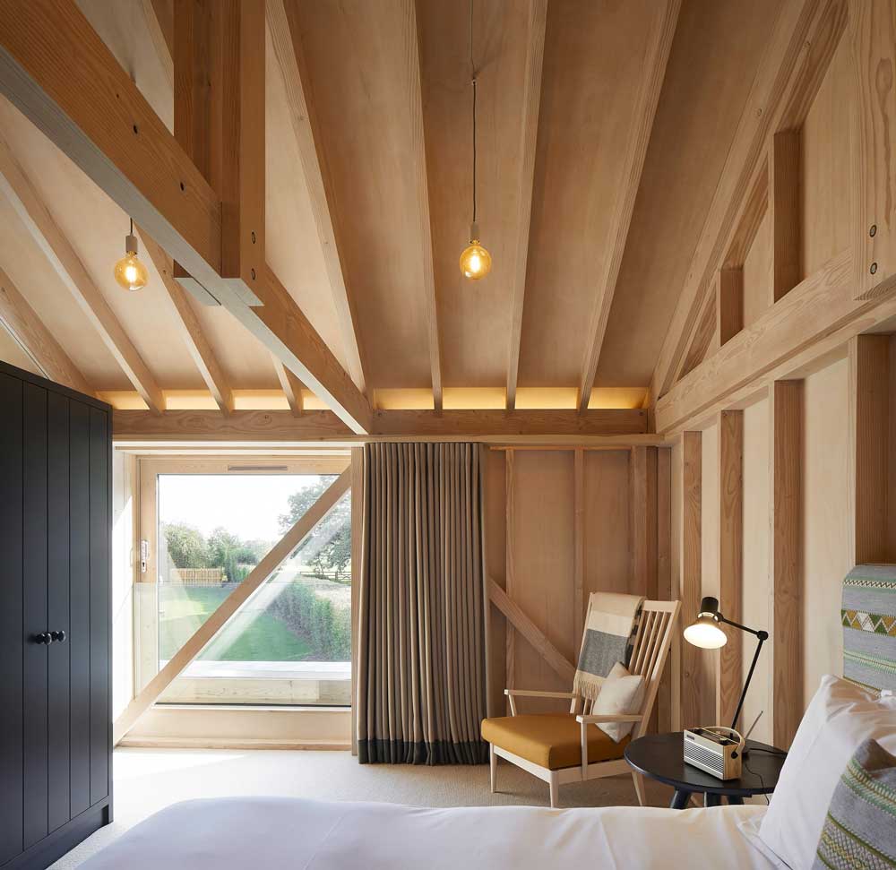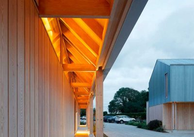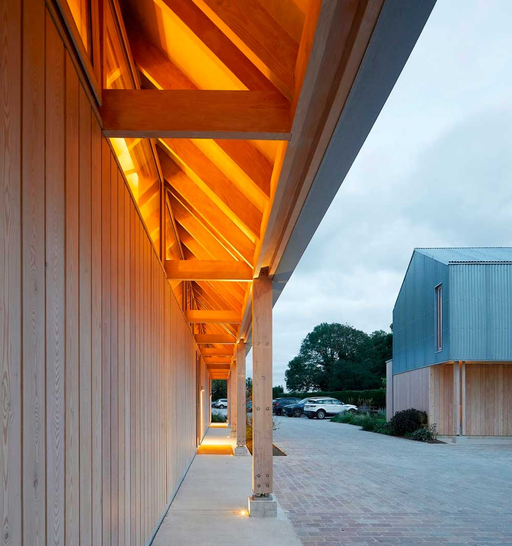 El esquema también refleja el carácter de las diversas granjas informales que rodean el green. Los edificios con entramado de abeto Douglas de cosecha propia utilizan materiales de construcción agrícolas auténticos, como techos de acero corrugado galvanizado y revestimiento de alerce, para crear la sensación de que los animales se mudaron recientemente. Se adoptó una tipología de construcción de estructura de madera simple para reflejar ‘La forma en que está construida, es la forma en que se ve’.