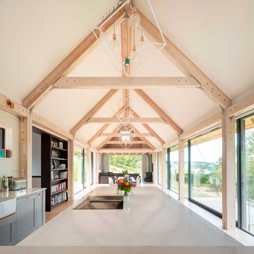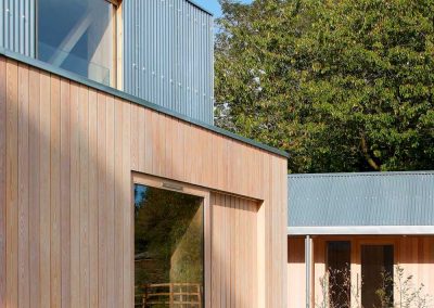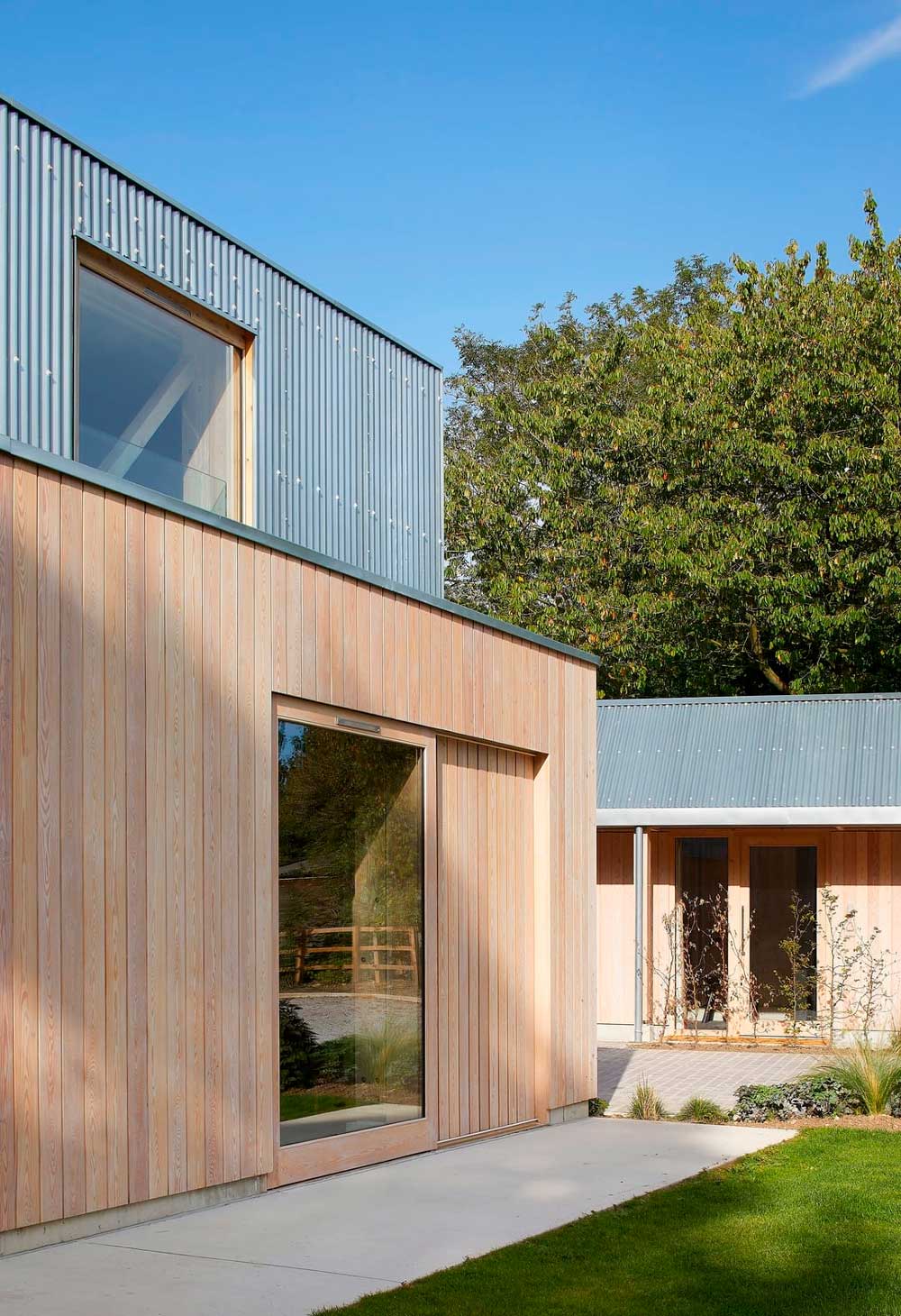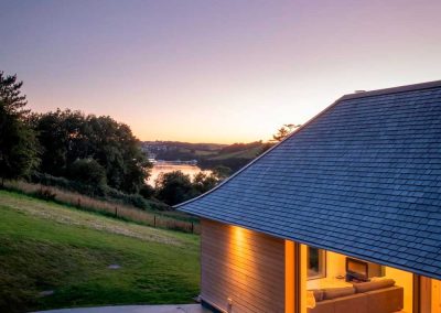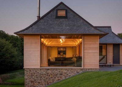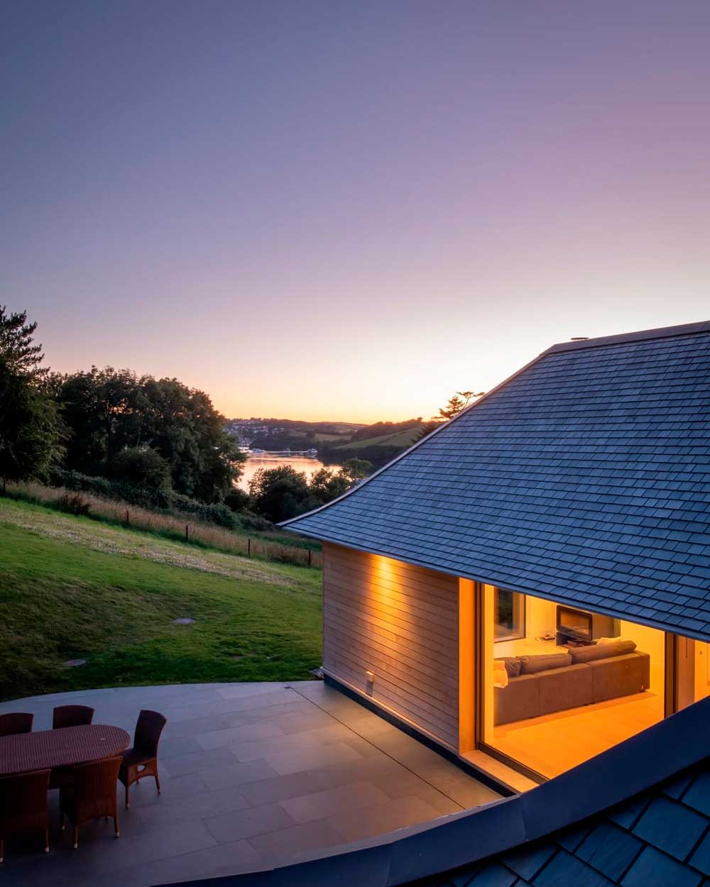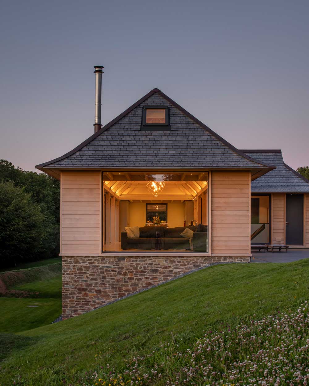 Esta casa familiar se encuentra en un entorno frondoso con vistas al estuario de Salcombe. El uso de materiales naturales de la residencia incluye un uso extensivo de madera, como las tejas de cedro amarillo y el revestimiento en el techo y el exterior, y el piso de la segunda planta de madera abeto Douglas.