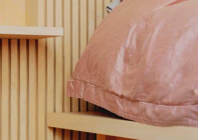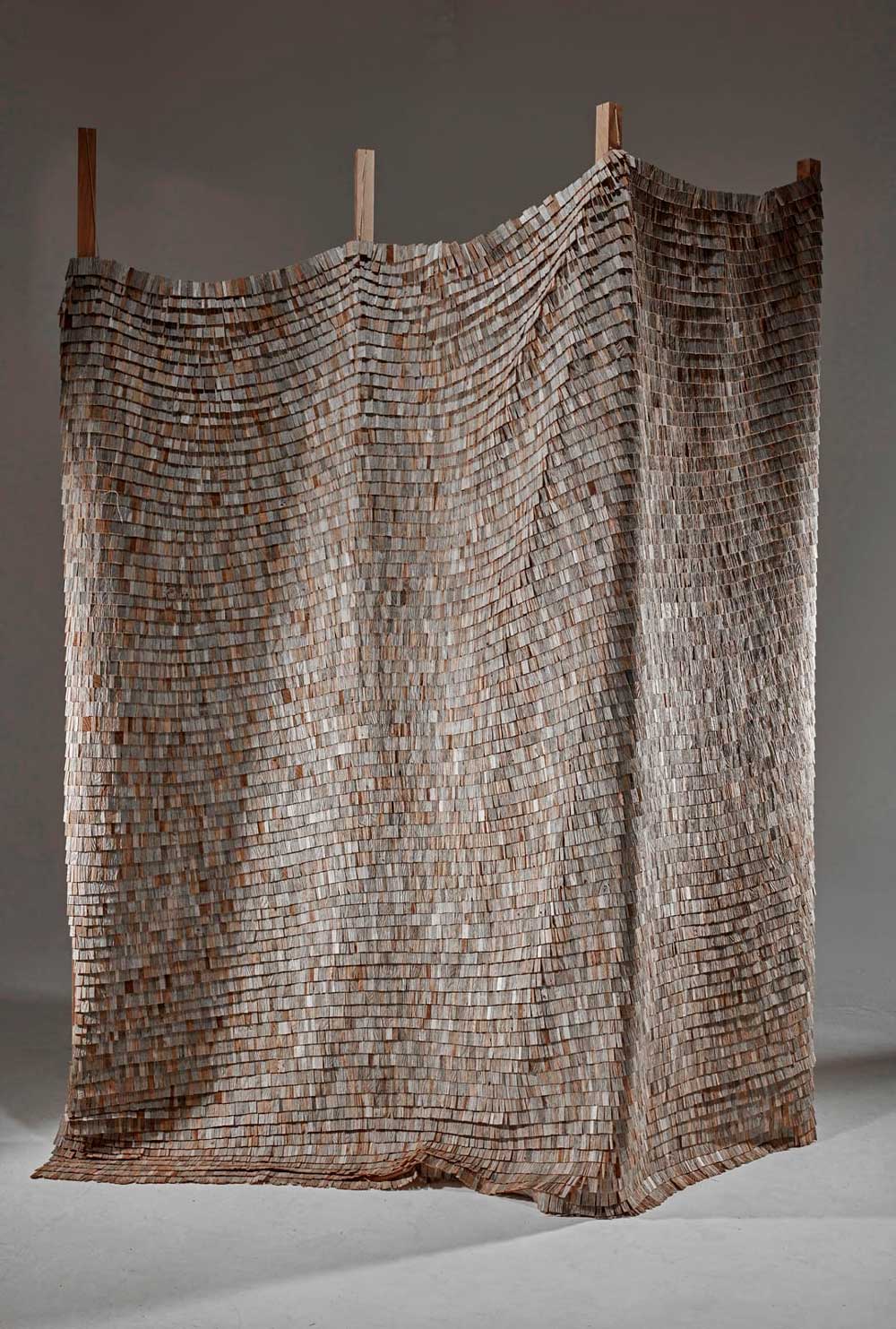 La categoría a medida vio una ligera reducción en las entradas, posiblemente porque durante Covid-19 los clientes estaban menos inclinados a presentarse. Sin embargo, Gayles Farm 5 de Wycliffe Stutchbury, un separador de ambientes en roble europeo fue un digno ganador. Stutchbury ha estado explorando técnicas textiles utilizando madera y la pantalla resultante es sensual y seductora, mostrando movimiento y delicadeza, no necesariamente características asociadas con el uso de la madera. Hecho de miles de pequeñas baldosas de roble cortadas de cercas de roble desechadas y recuperadas de South Downs, está adherida a una tela cruzada de algodón de tejido abierto, creando una cortina.