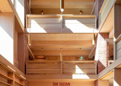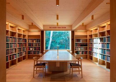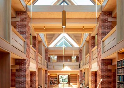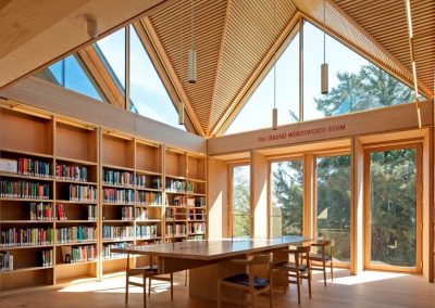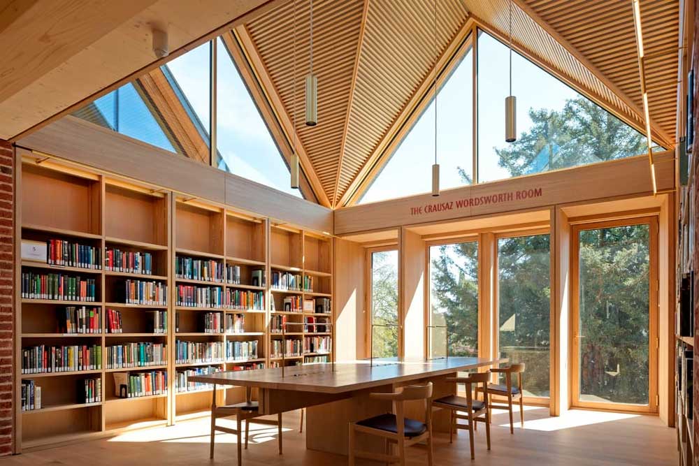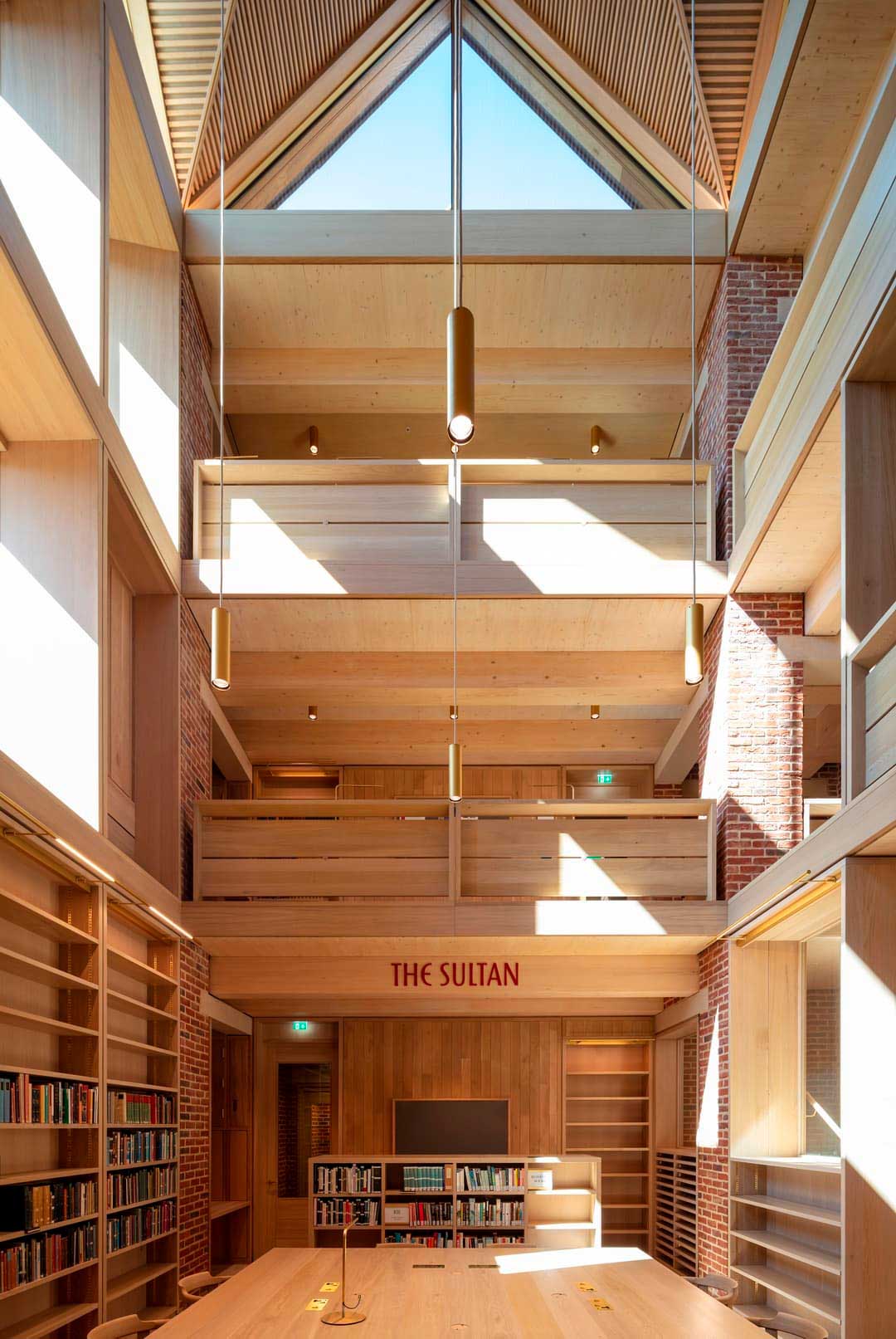 Una ampliación sustancial a un complejo existente, el proyecto de la Biblioteca del Magdalene College presenta volúmenes simples de ladrillos, ventanas de madera y techos inclinados ‘que hacen eco de la arquitectura a dos aguas de la universidad’, que es parte de la Universidad de Cambridge. Los interiores están realizados con estructura de madera laminada encolada (madera laminada encolada) y CLT (madera contralaminada), con carpintería de estantería de roble. Desde columnas hasta vigas del piso, estantes, marcos de ventanas y escritorios, la madera es omnipresente y trabaja arduamente en este proyecto de arquitectura de Níall McLaughlin Architects.