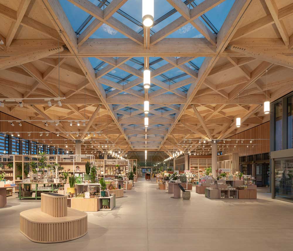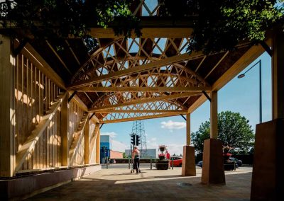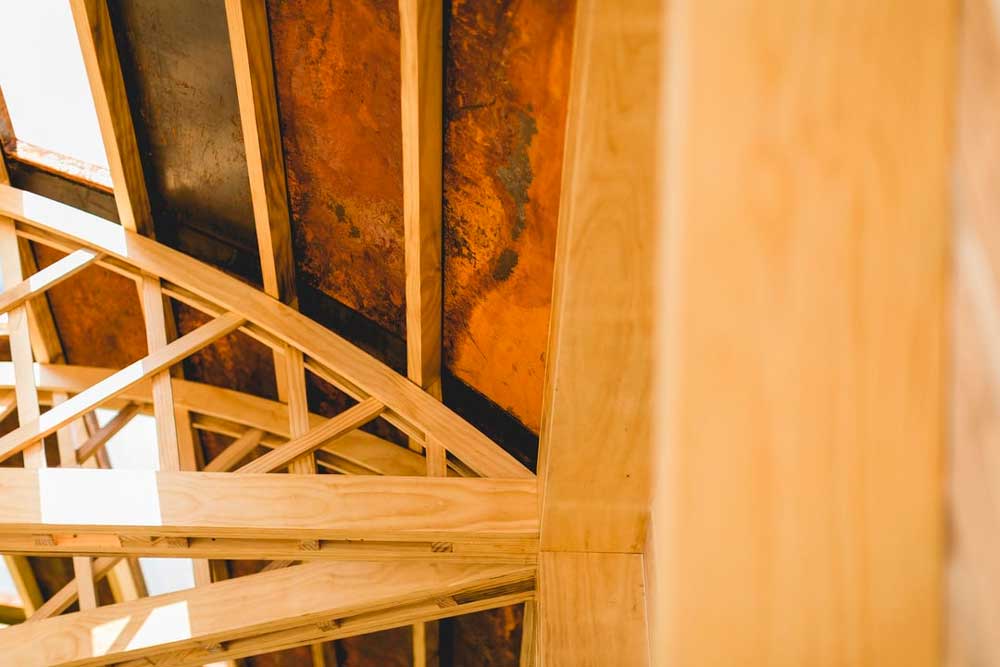 El pabellón es un conjunto de tres elementos, cada uno elaborado en una fábrica local. Las habilidades artesanales tradicionales se combinaron con tecnologías innovadoras para crear componentes de construcción a medida que podrían ensamblarse rápidamente en el sitio. Los prototipos de truss y uniones a escala 1: 1 se produjeron mediante CNC para desarrollar el diseño de cada conexión. Para probar el ajuste de cada elemento, toda la estructura del techo se ensambló en la fábrica antes de ser desmantelada y transportada al sitio.