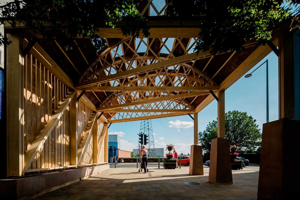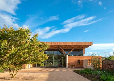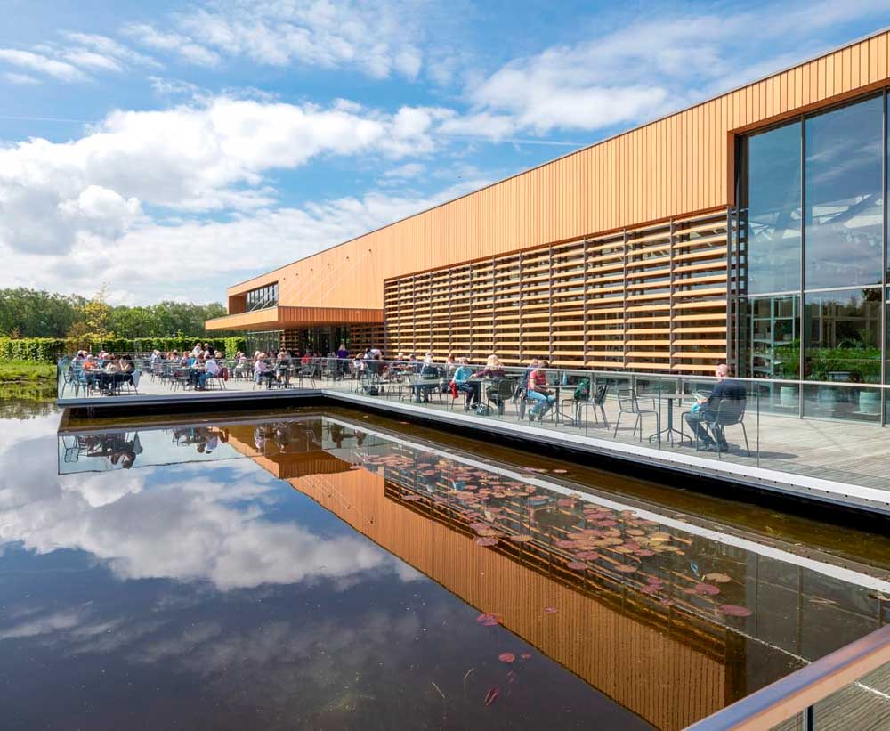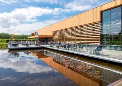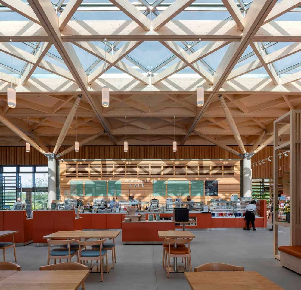 El diseño es una composición horizontal de baja altura que responde a un horizonte imponente definido por el canal Bridgewater elevado y el paisaje de baja altitud, creando un golpe lineal en el paisaje. El edificio es predominantemente un espacio abierto. Todos los elementos públicos están contenidos bajo una sola cuadrícula de madera laminada, sostenida por árboles estructurales en madera laminada. El techo se extiende más allá del cerramiento hacia el norte y el sur, difuminando el borde entre edificio y paisaje.