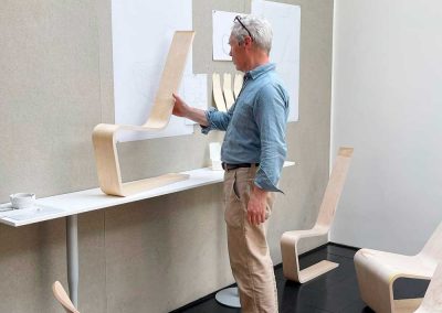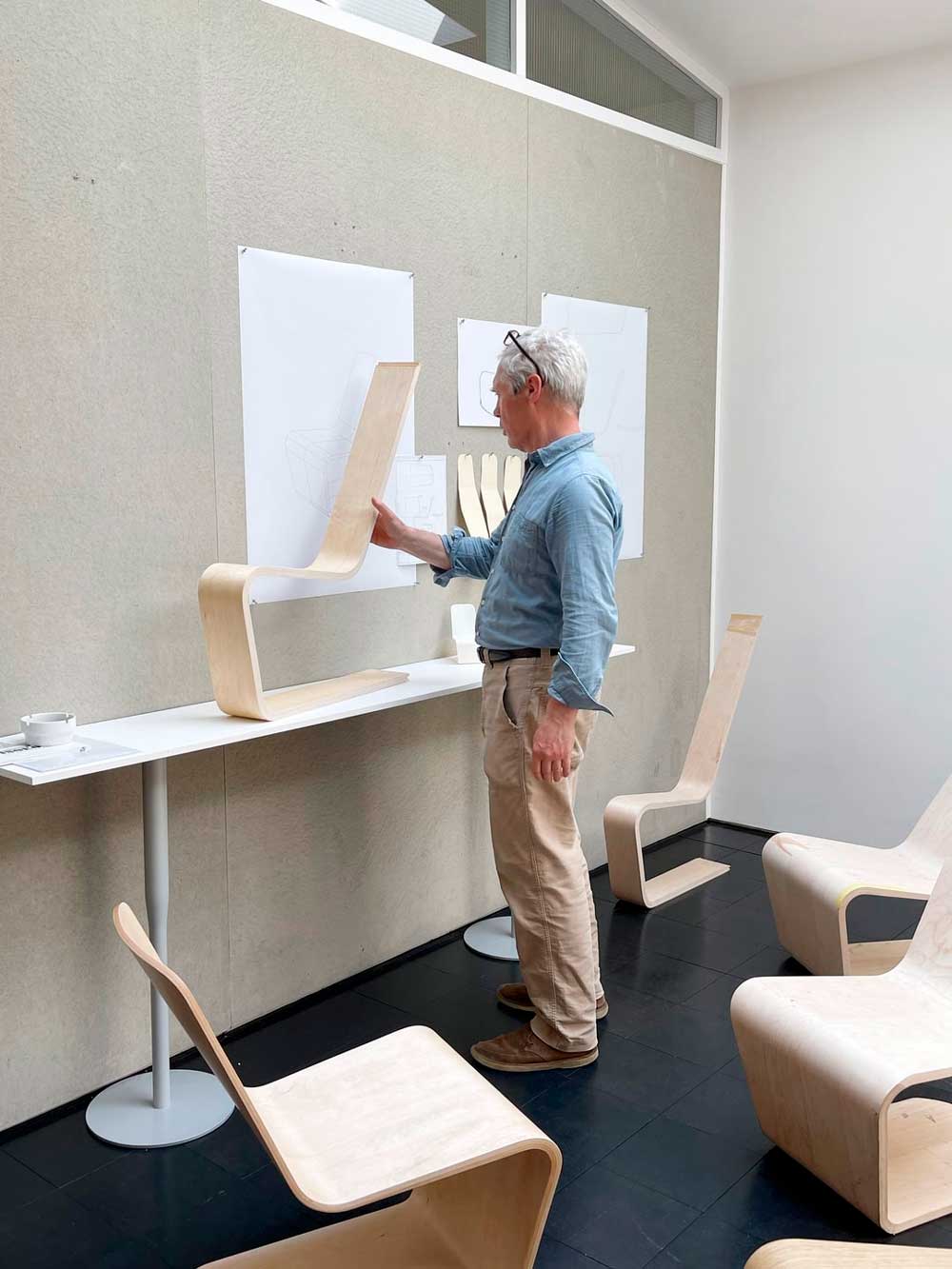 El diseño de Jasper Morrison del Iso-Lounge comenzó como un boceto único en el que la mano fluía desde el respaldo del asiento hasta el piso. La madera contrachapada fue la única opción de material que siguió la curva del diseño en voladizo. La silla en voladizo se basa en una producción altamente técnica para crear equilibrio y soporte, especialmente cuando se produce en chapa de madera. Más de cuatro prototipos completos, junto con muchas secciones de prototipos se hicieron en el transcurso de un año para crear una pieza que ofreciera un apoyo total y maximizara la comodidad. Donde necesitaba ser fuerte, hay más capas y donde no necesita ser tan fuerte y debe flexionarse, hay menos capas: la silla se ha perfeccionado para que sea increíblemente receptiva.