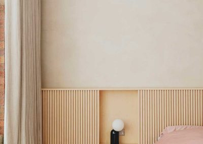 La transformación de un espacio de apartamento victoriano en una casa familiar cálida y acogedora, con un guiño a la historia de su sitio, St John Street. El hormigón visto y el ladrillo se combinan con franjas de carpintería a medida que cubre estanterías, almacenamiento y accesorios y muebles a medida. Los interiores cuentan con contrachapado de abedul lavado a la cal contrastando en el parquet de roble.