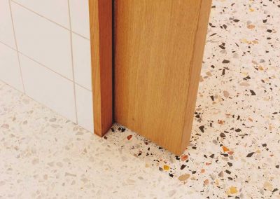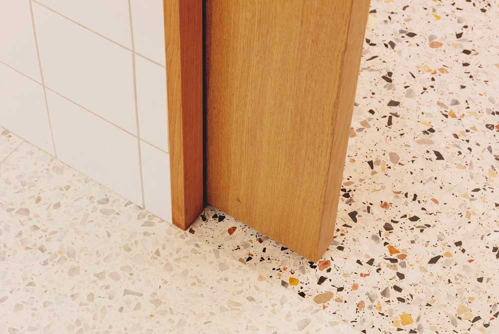 La geometría y los materiales utilizados se expresan de diferentes maneras en diferentes pisos. Los materiales sobre el suelo son madera, rectos y deliberadamente hechos por el hombre. Bajo tierra, el énfasis está en la piedra y las curvas naturales, desde un banco curvo y un perchero hasta puertas curvas.
