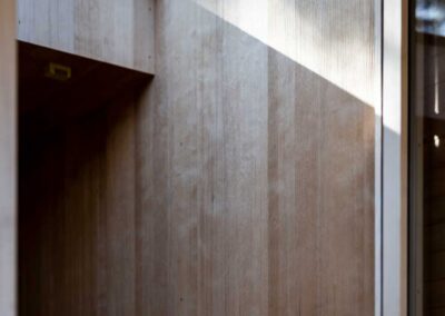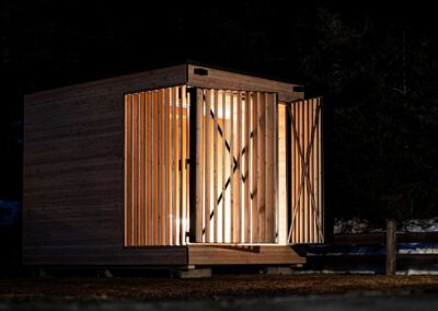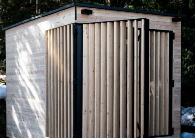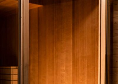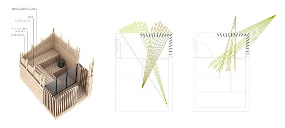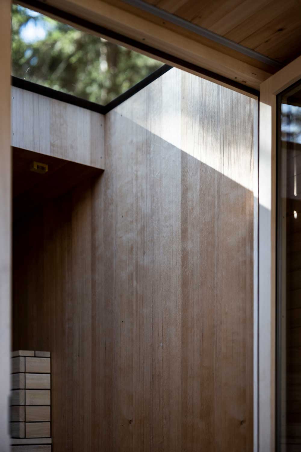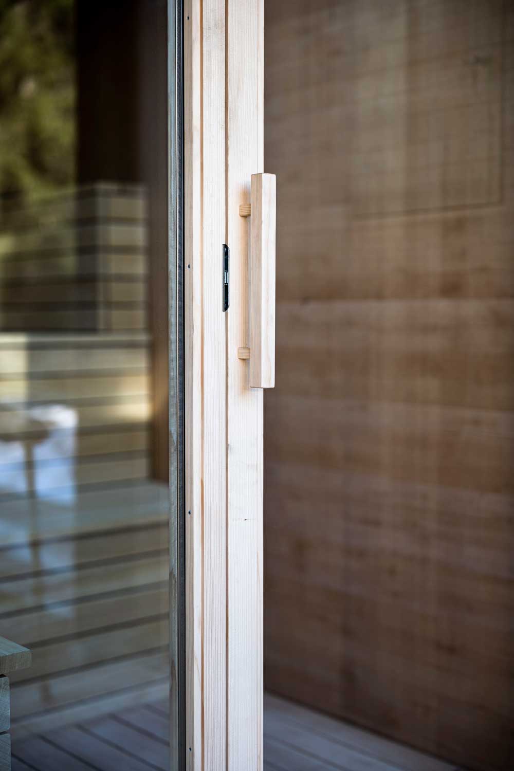 Es en este punto donde la madera se manifiesta en uno de sus elementos más expresivos: unos listones verticales dispuestas en forma de abanico. Estas no solo cierran y definen la antesala, sino que funcionan como una pantalla de privacidad. La magia reside en su inclinación calculada: protegen la intimidad de quien descansa desde el exterior, pero permiten una vista despejada del paisaje desde el interior de la sauna. Es un diálogo constante entre el refugio y el entorno, una manera de no desconectarse del mundo, sino de observarlo desde la calidez.