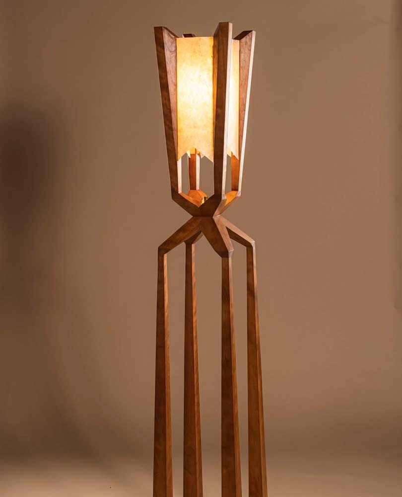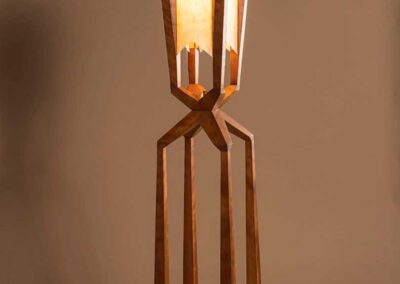 Inspirada en la naturaleza, su forma cónica captura y contiene la luz en sus pantallas de lino, creando una armoniosa combinación de belleza orgánica y funcionalidad.