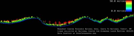 Esta imagen de LIDAR demuestra que los árboles en valles son más altos, demostrados en rojo, mientras que los árboles en las cimas de las montañas son más cortos, anotados en verde.