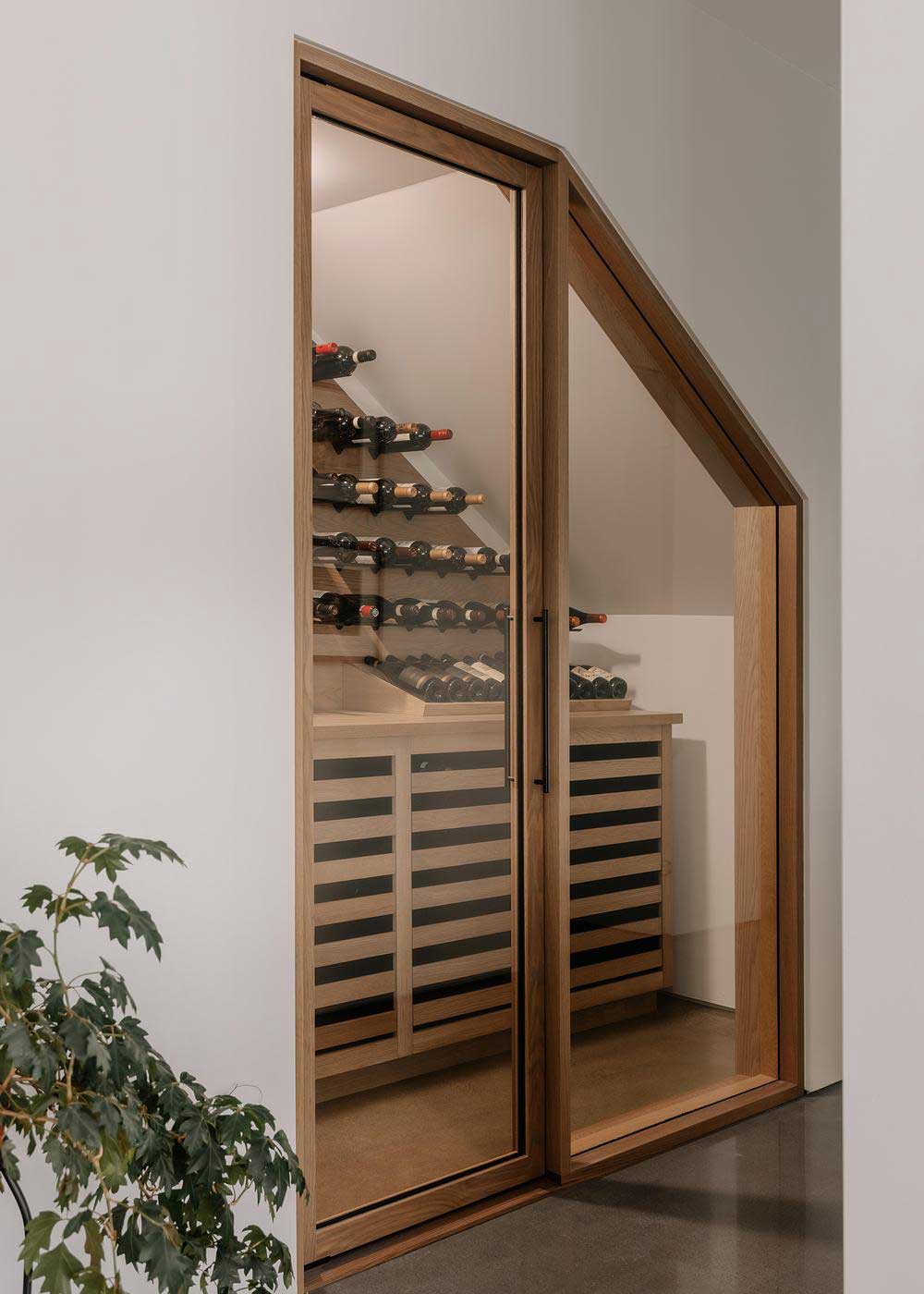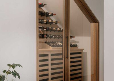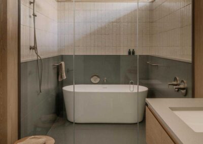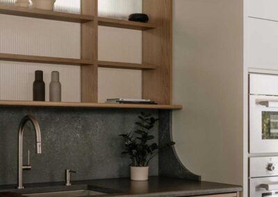 La carpintería y los componentes interiores a medida, desde los paneles de vidrio con marco de madera hasta la biblioteca empotrada que enmarca el televisor, oscilan entre la solidez y la delicadeza. En contraste con superficies más brillantes de yeso y laca, estos elementos reivindican un lenguaje en el que la madera predomina sin sobrecargar el espacio.