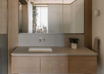 El voladizo longitudinal desempeña un papel central en esta estrategia. Lejos de ser un gesto icónico, responde ante todo a la lógica del lugar. Al suspender la casa a lo largo de la pendiente, el equipo logró reducir la excavación cerca del edificio y limitar el impacto en las raíces de los árboles maduros. Esta proyección genera un paseo periférico y, a nivel del jardín, una zona protegida de dos metros y medio de profundidad frente a la piscina: un espacio intermedio, ni completamente interior ni exterior, donde el paisaje está literalmente habitado.
