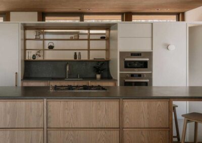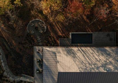 En lugar de remodelar la topografía, la arquitectura se suspende en ella. Las plantas extendidas y los planos de cubierta funcionan como instrumentos precisos, enmarcando las vistas y creando un claro cuidadosamente medido alrededor de la casa. Desde la distancia, el edificio se percibe como una forma suavemente colocada, casi envuelta, a la vez sólida y ligera.