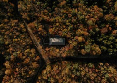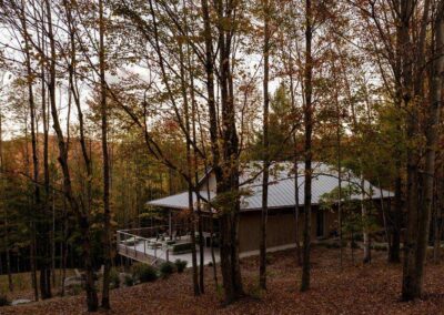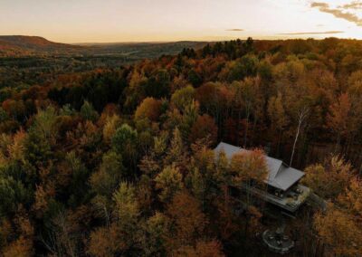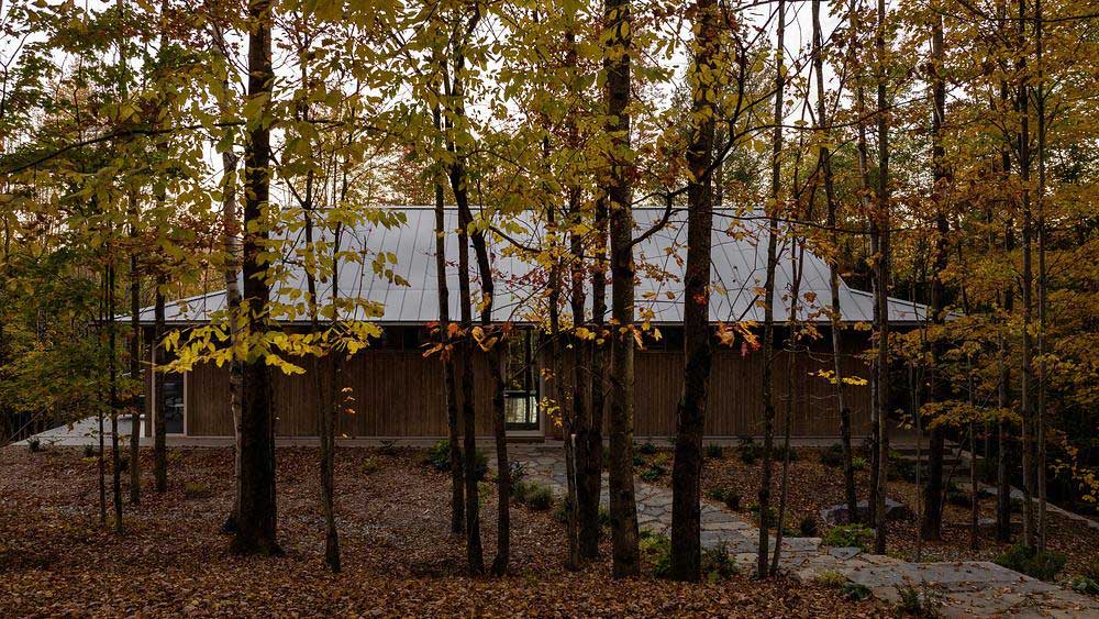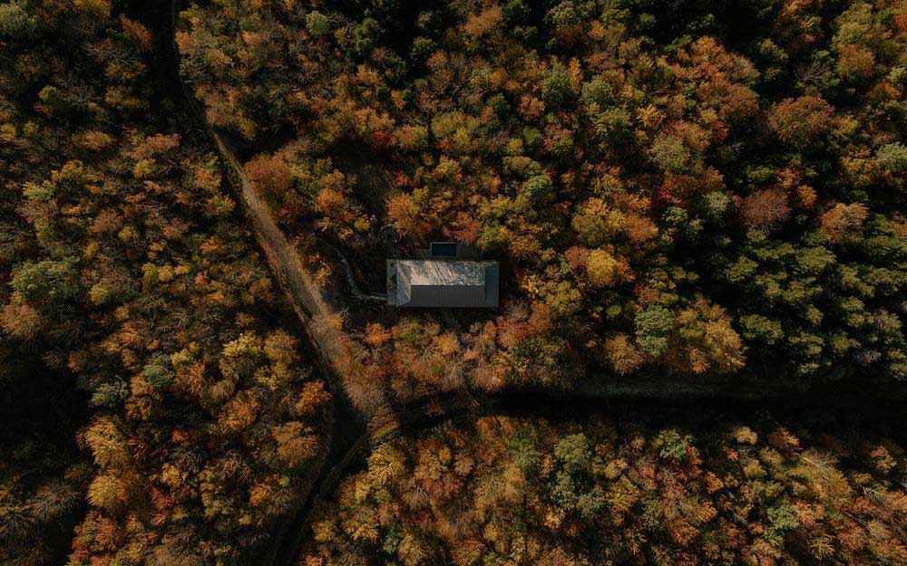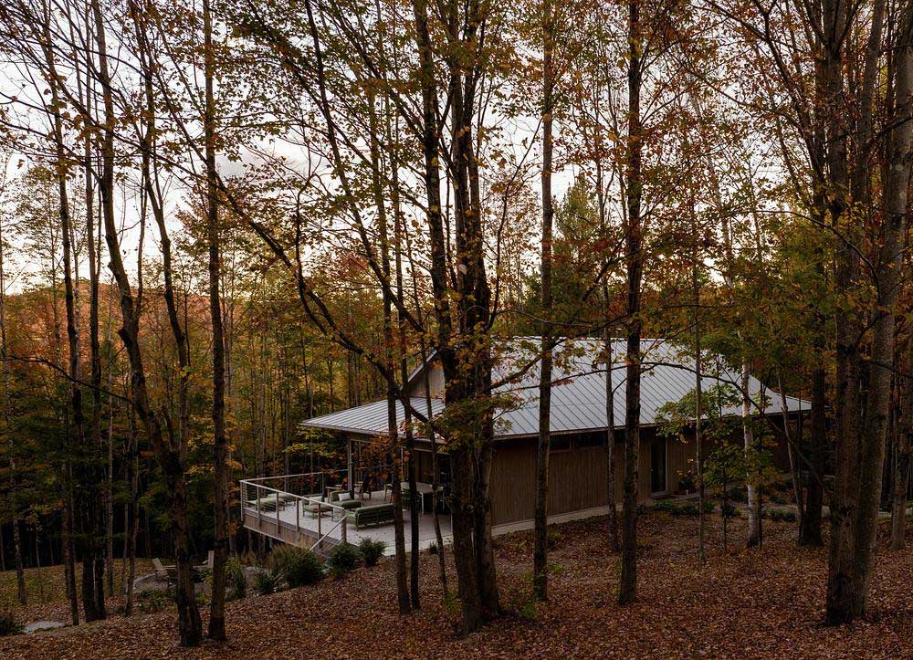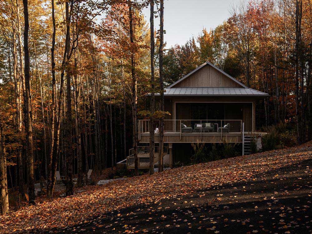 Ubicada en un terreno arbolado de arces, el terreno desciende suavemente hacia un valle donde un río traza su curso al pie del terreno. Es dentro de este movimiento natural del terreno que Perchée cobra forma: una casa que prioriza la sobriedad sobre la huella, y cuya estrategia de ubicación busca, sobre todo, limitar la tala para preservar la cualidad más valiosa del sitio: la sensación de estar verdaderamente inmerso entre los árboles.