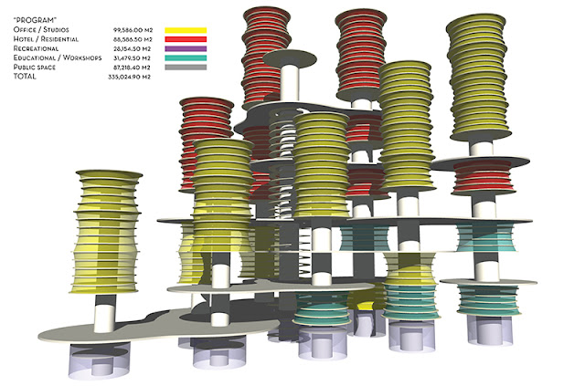 El conjunto arquitectónico innovador y creativo que plantean desde el estudio en este proyecto, «Torre de Bambú», está compuesto por oficinas, viviendas, hoteles y zonas recreativas envueltas por un espacio público capaz de fomentar la interrelación de los habitantes y proporcionar un alto nivel de autocontención, una comunidad de personas que trabajan y conviven en la misma zona. La relación entre los edificios y las zonas comunes se resuelven con plataformas en altura que conectan los diferentes núcleos.