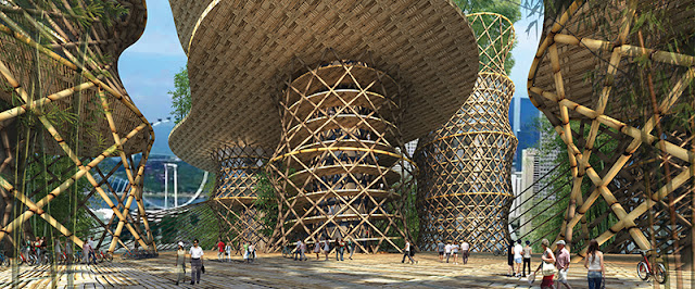 Quienes trabajan y conocen con detalle un material como el bambú-guadua, saben de lo especial de este proyecto. Tanto por su sofisticación técnica y de diseño, como por la relevancia y envergadura que tiene en el marco de la sostenibilidad. CGR Architects, estudio nacido en Barcelona y que se ha expandido a China, Estados Unidos y África, ha diseñado un concepto de ciudad sostenible con alma de aldea urbana, de pueblo totalmente ecológico y eficiente, pensado para ubicarse en Singapur. Cuenta con un programa de casi 250.000 metros cuadrados y se eleva hasta los 200 metros de altura.